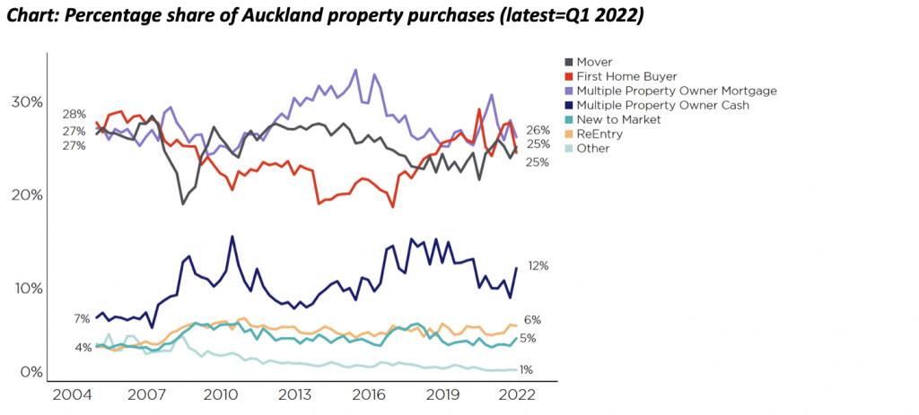 What about in Auckland? As the chart shows, these same trends broadly prevail – e.g. cash investors have perked up a bit, movers are creeping higher, and first home buyers have dipped a little. However, the percentages themselves are different, and that’s certainly the case for mortgaged investors. Yes, that share has dropped from where it was a year ago (31%), but at 26% in Q1 2022 it remains higher than the national figure.