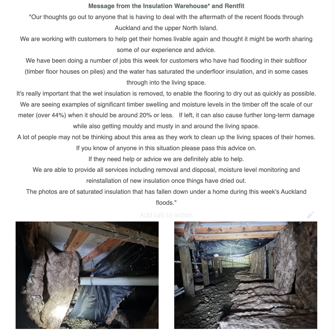 Make sure you have clear documentation on efforts on your part to assess and remediate the damage(s) to HHS features including records of inspection, communication with tenants, engagement of tradespeople, quotes/invoices etc. We have reached out to Tenancy Services and its Compliance and Investigations Team for their guidance and assurance that it would take the floods into consideration should your property be assessed/investigated.