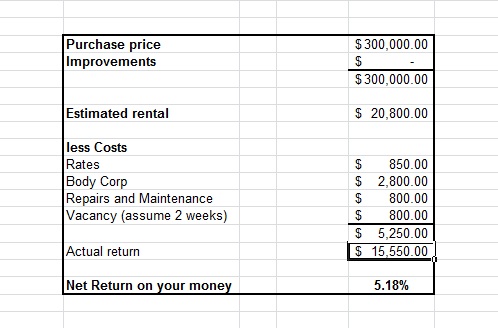 Auckland CBD freehold apartment selling at $300,000 with an assessed market rent of $400 p.w.  Body corp fee of $2,800 p.a. and rates of 850 p.a.  Assume 2 weeks vacancy which is when you will be carrying out major repairs and maintenance (budgeted at $800 p.a.).  Fully financed at today’s ANZ New Zealand floating rate of 5.74% p.a. minus your APIA home loan discount.  Assume no further costs.